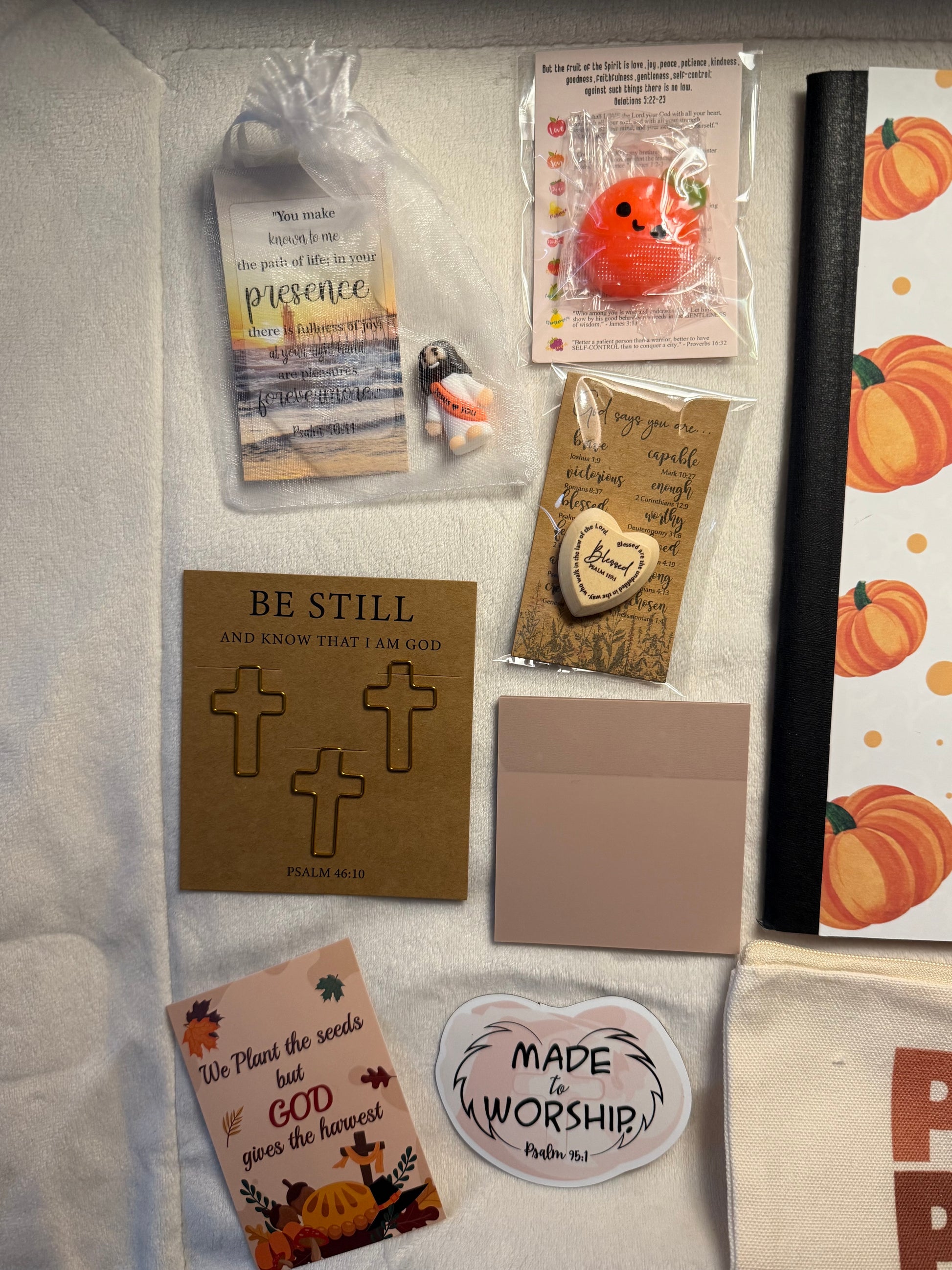 - 12 Stationery Items: Includes washi tape, bookmarks, sticky notes, scripture cards, keychains, pens, and more.